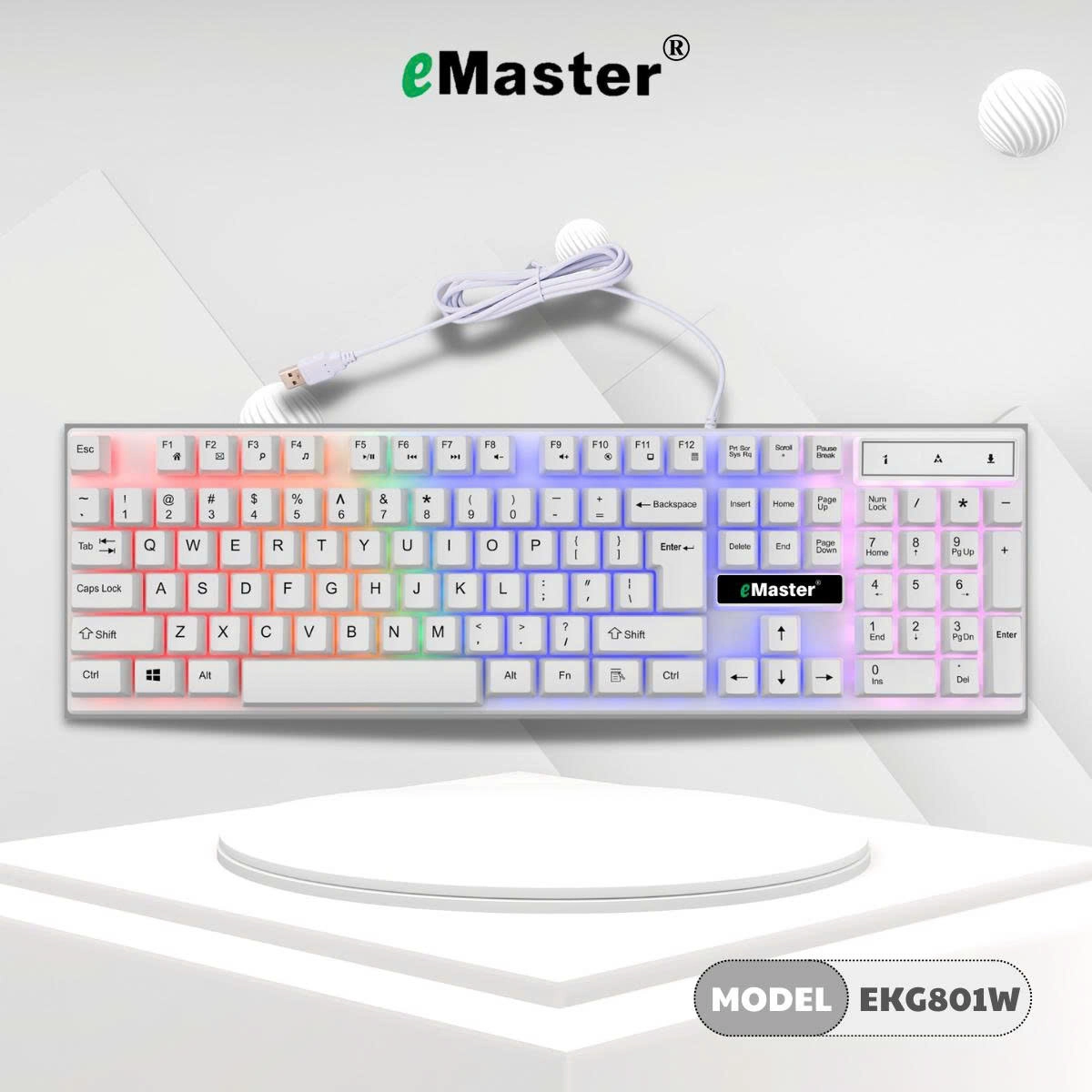 Phím LED 7 màu EMASTER EKG801W là bàn phím fullsize 104 phím, thiết kế hiện đại với màu trắng sang trọng, thích hợp cho văn phòng, học tập và chơi game. Keycap trắng với ký tự in lụa đảm bảo độ bền lâu dài, kết hợp đèn LED 7 màu sống động, mang lại trải nghiệm gõ phím thú vị và thẩm mỹ.